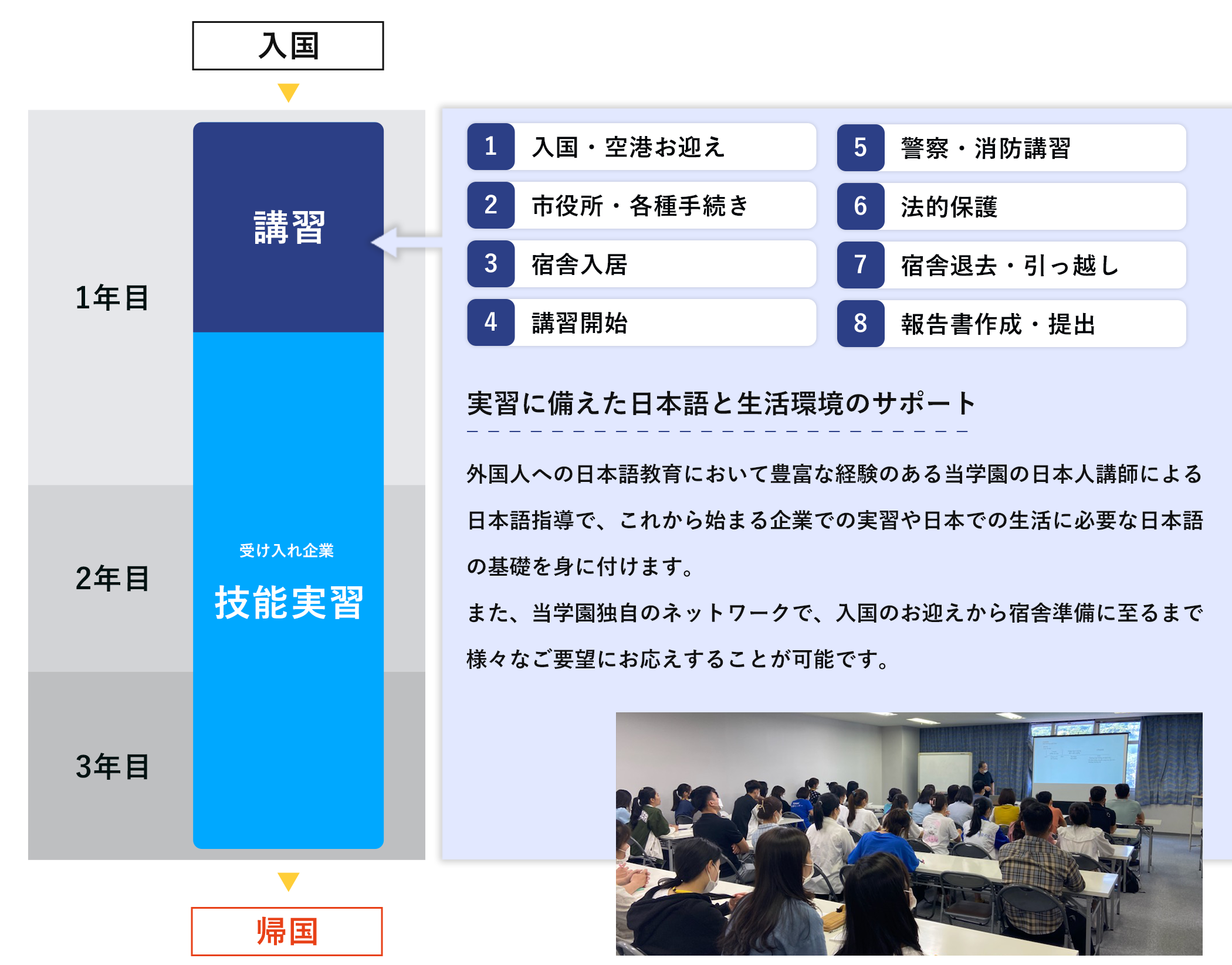 有資格者による日本語講習、行政書士による法的保護、消防署・警察署による各講習を受講していただけます。