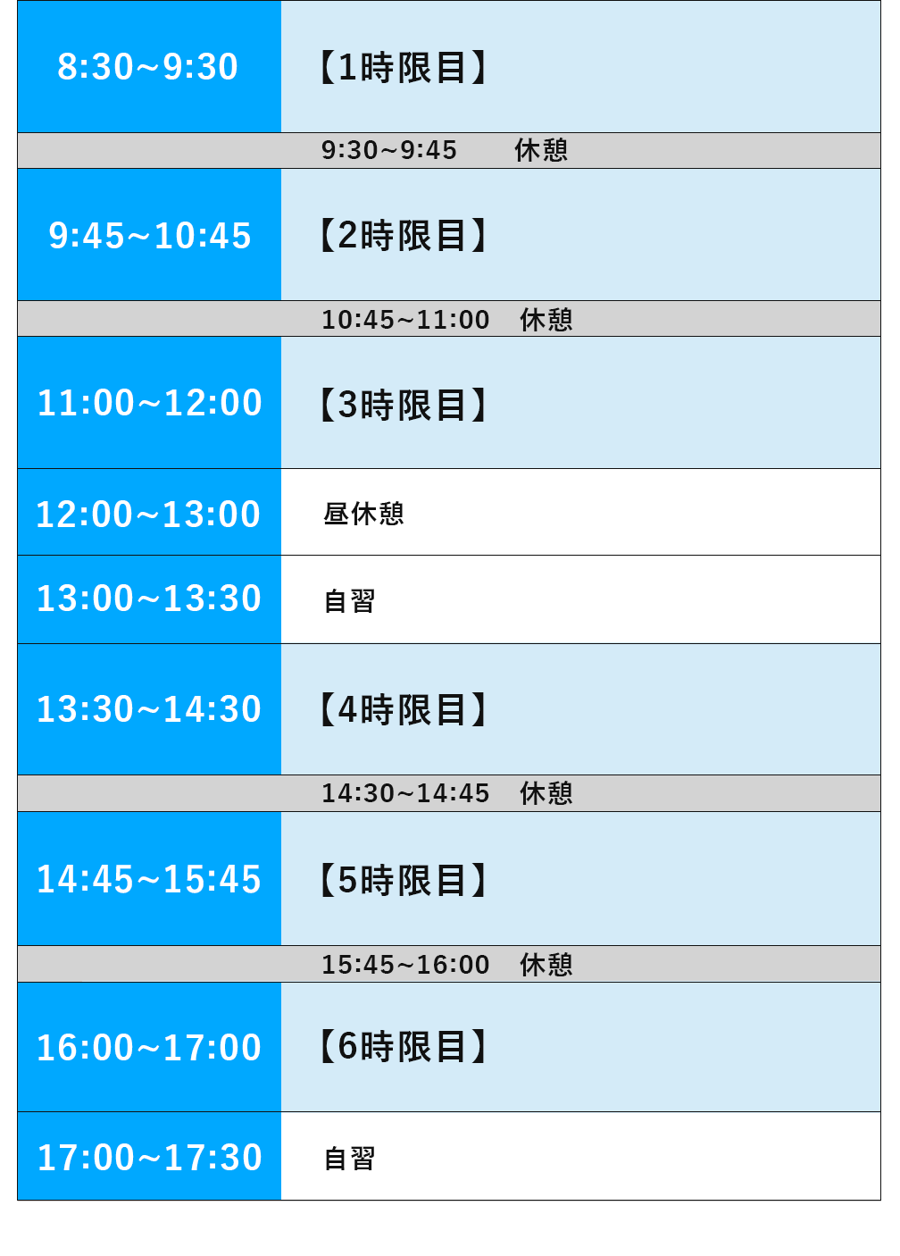午前と午後に講義や実技を受け、12:00から1時間のお昼休みを挟みます。6限目終了後には、自習時間も設けられており、学んだ内容を復習したり、日本語の練習をする時間として活用できます。全体のスケジュールは17:30に終了します。